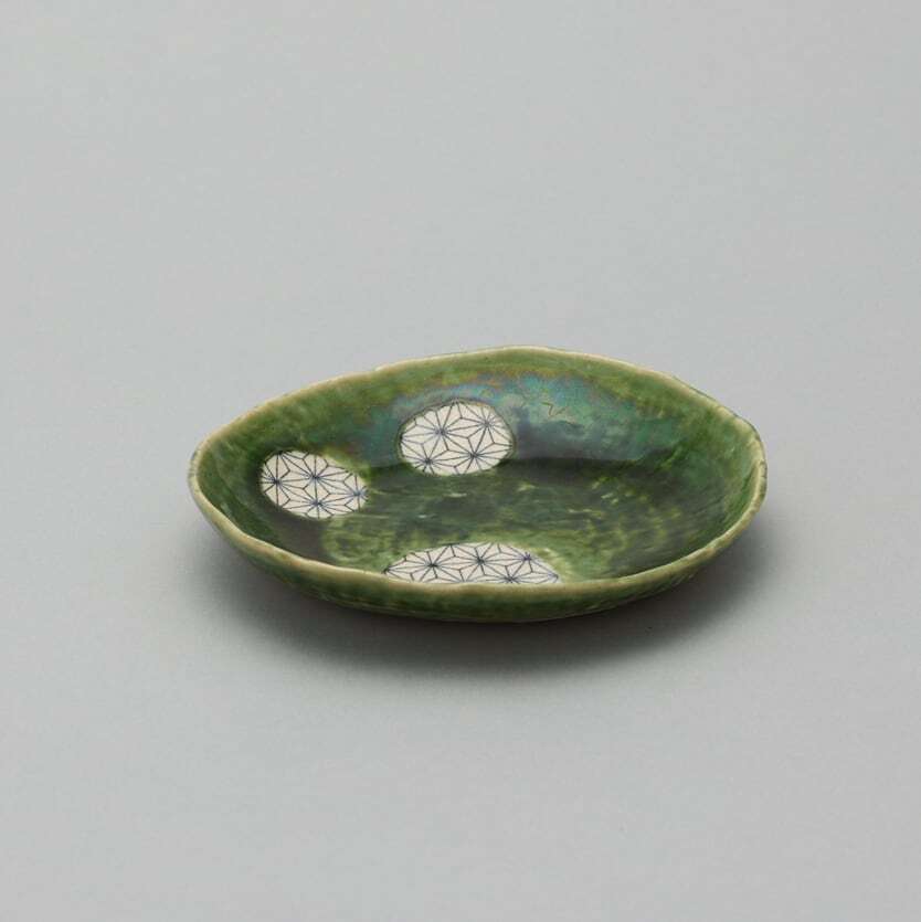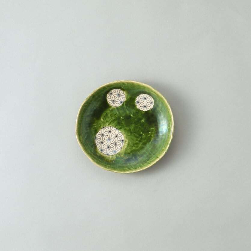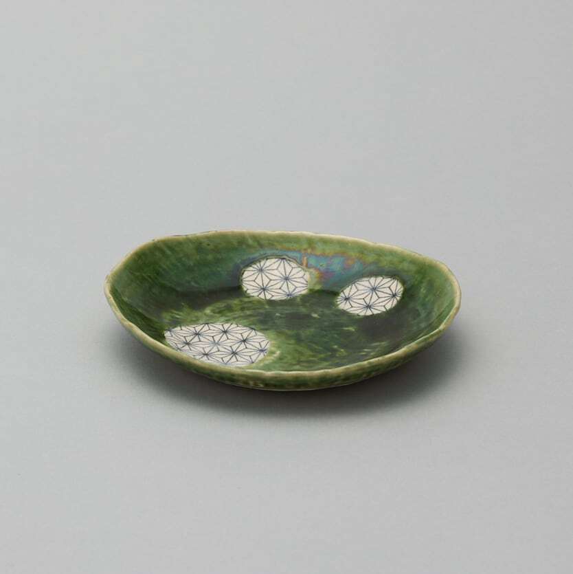 瀬戸焼窯元 江風窯による伝統的な織部に「麻ノ葉」をポップなドット柄に抜いたカジュアルにお使い頂けるプレートです。