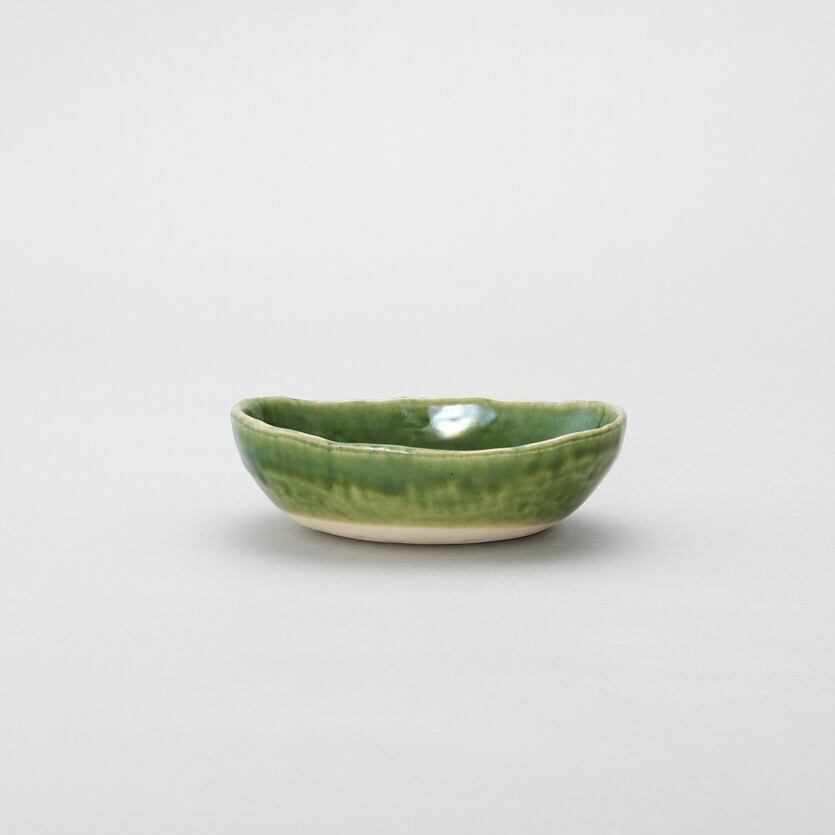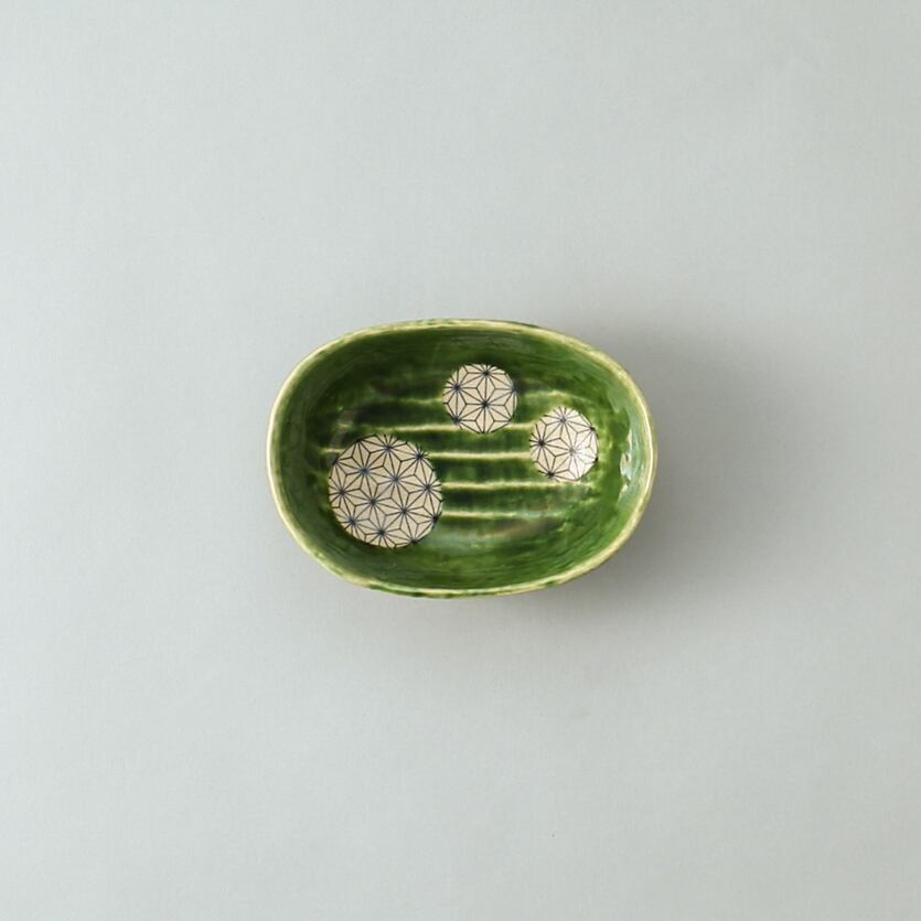 瀬戸焼窯元 江風窯による伝統的な織部に「麻ノ葉」をポップなドット柄に抜いたカジュアルにお使い頂ける縁起の良い小判型の小鉢です。