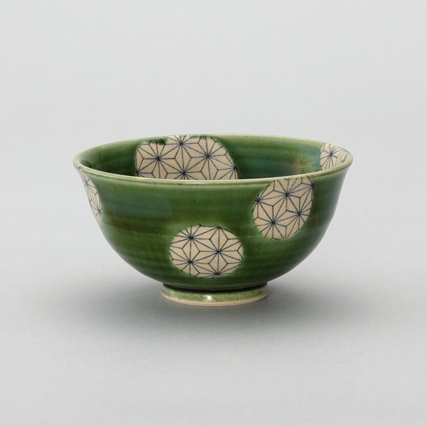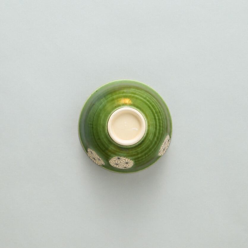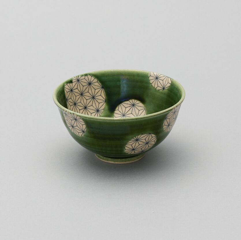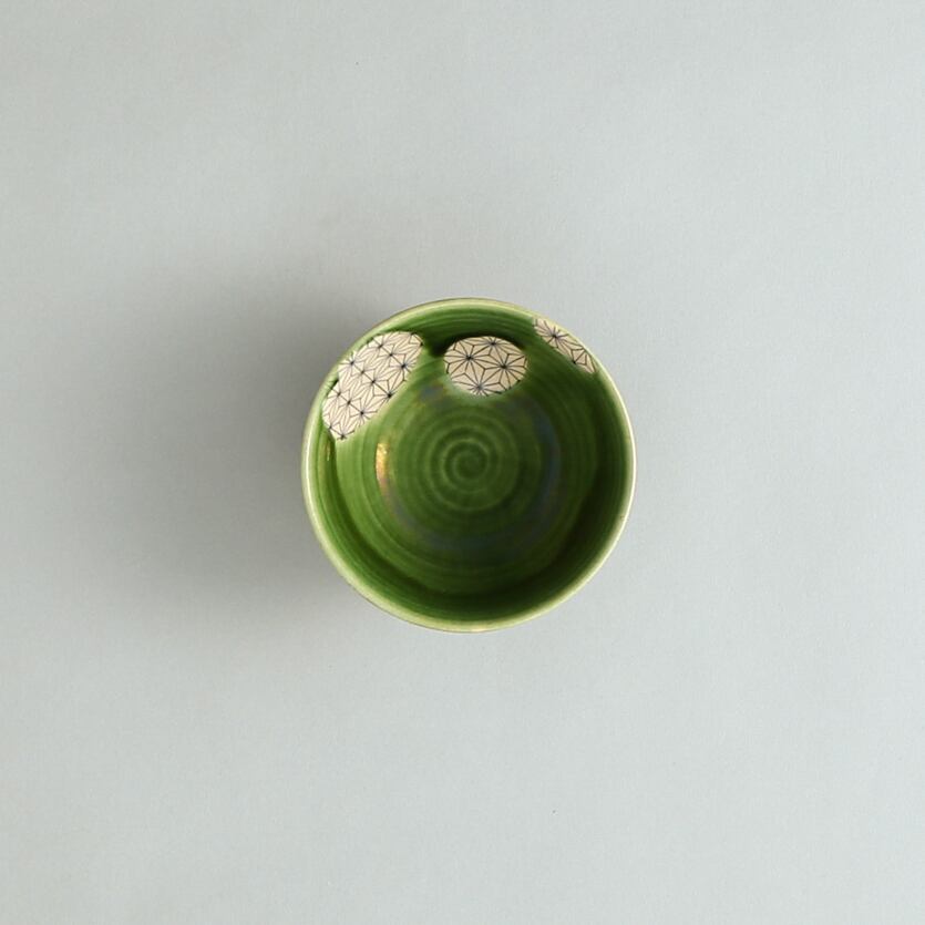 瀬戸焼窯元 江風窯による伝統的な織部に「麻ノ葉」をポップなドット柄に抜いたカジュアルにお使い頂ける小振りの茶碗です。