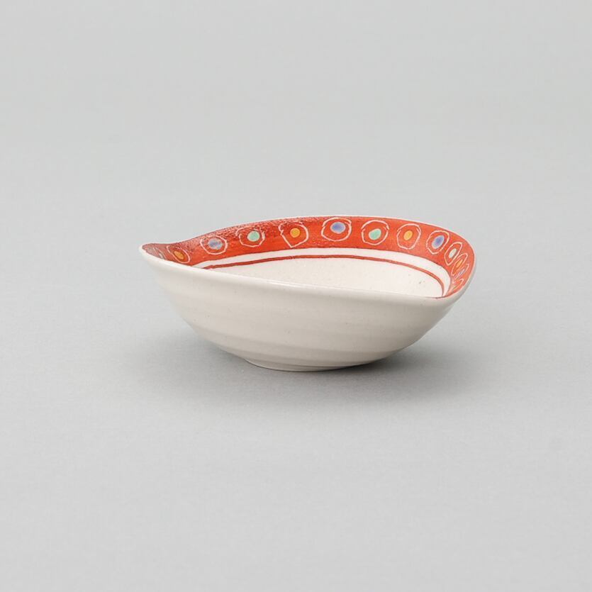 かわいらしい形に赤絵で彩をほどこしました。かさなりも良く、収納に便利です。
